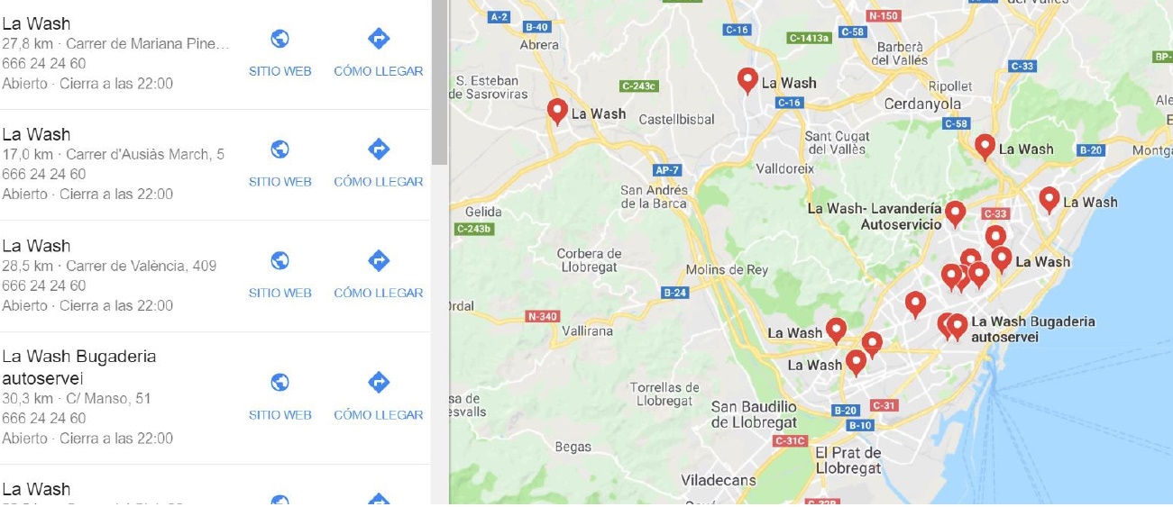 Ubicación geográfica de las lavanderías de autoservicio La Wash con Google Maps